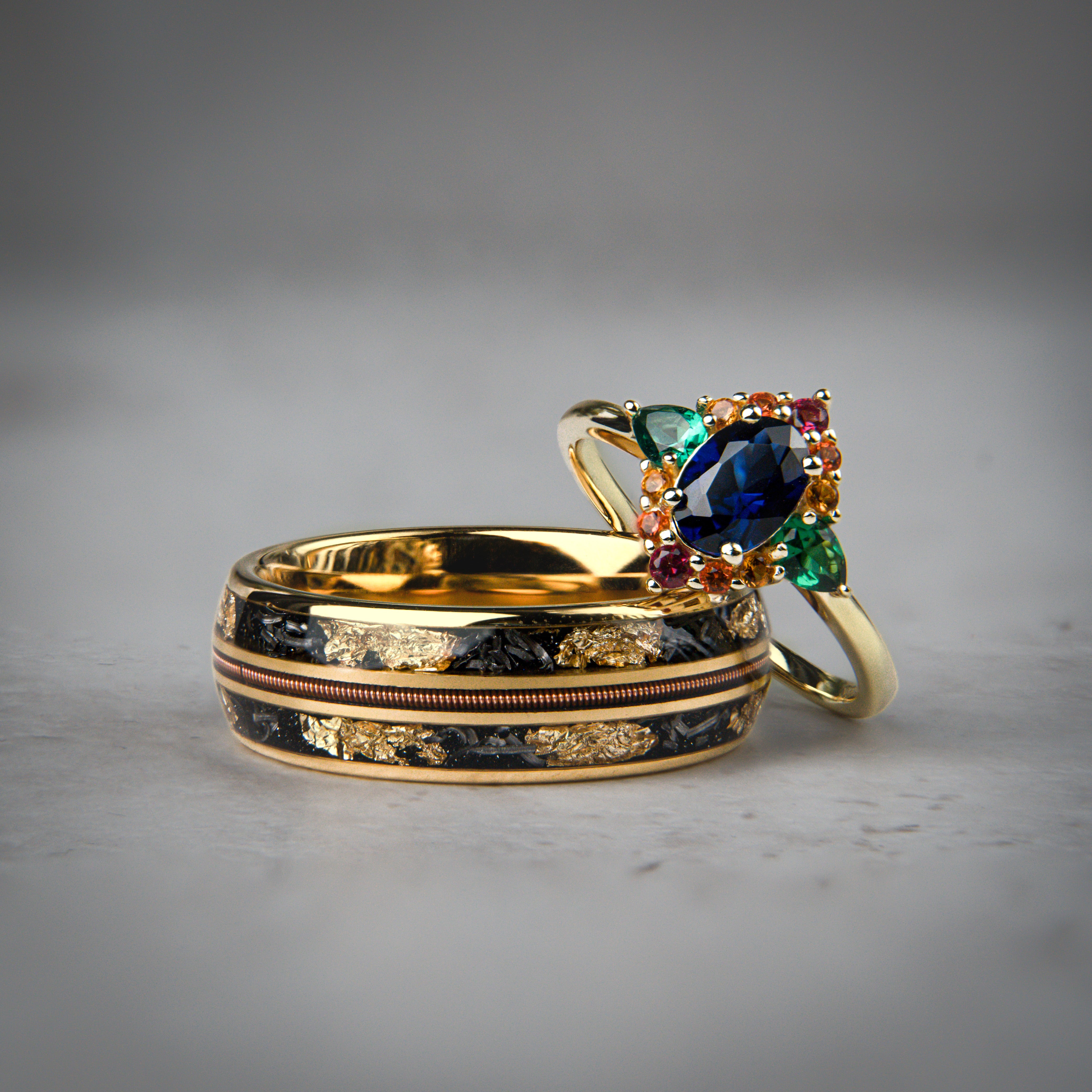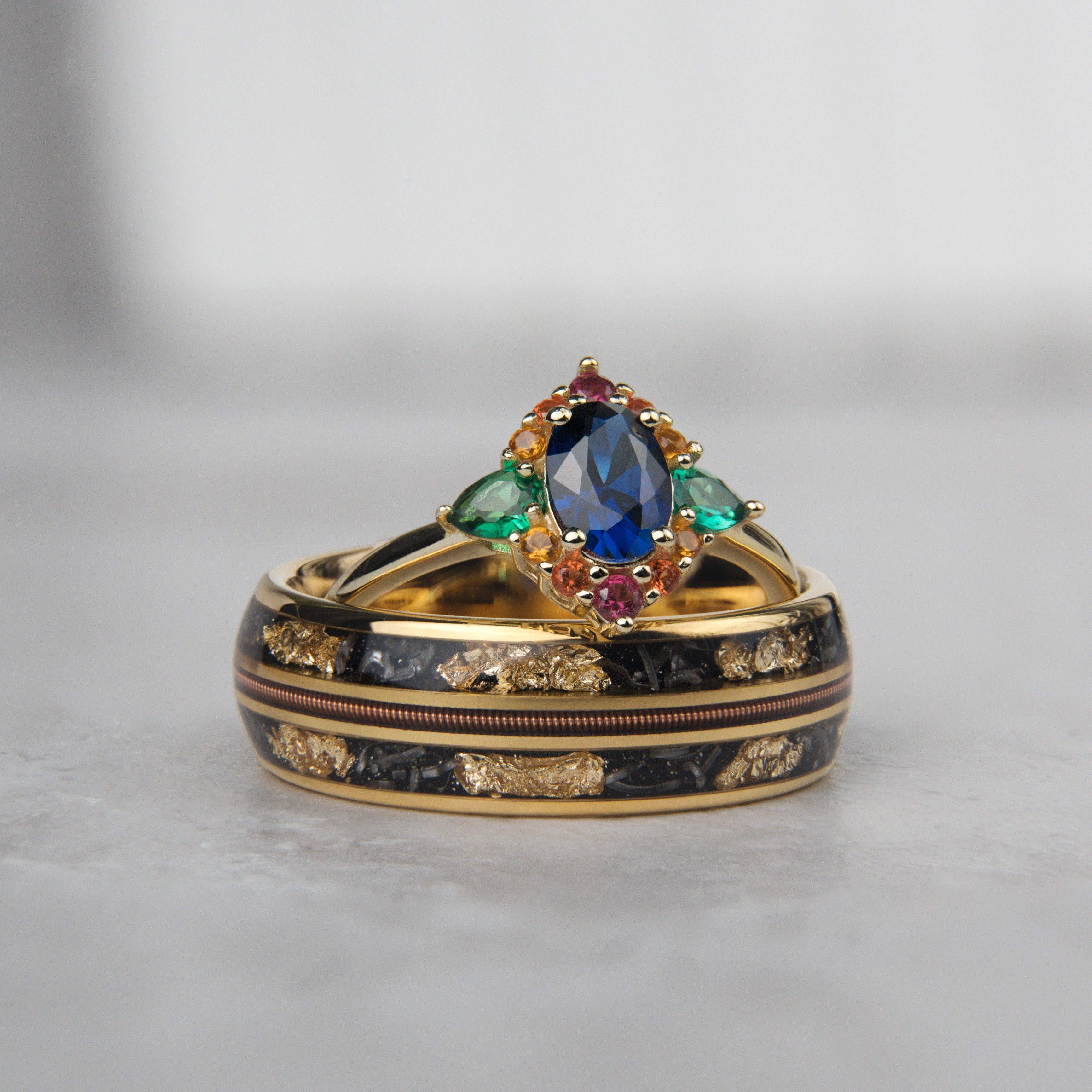 Sapphire, Emerald with Zircon Woman's and Man's Tungsten 18K Filled Rings