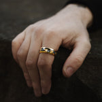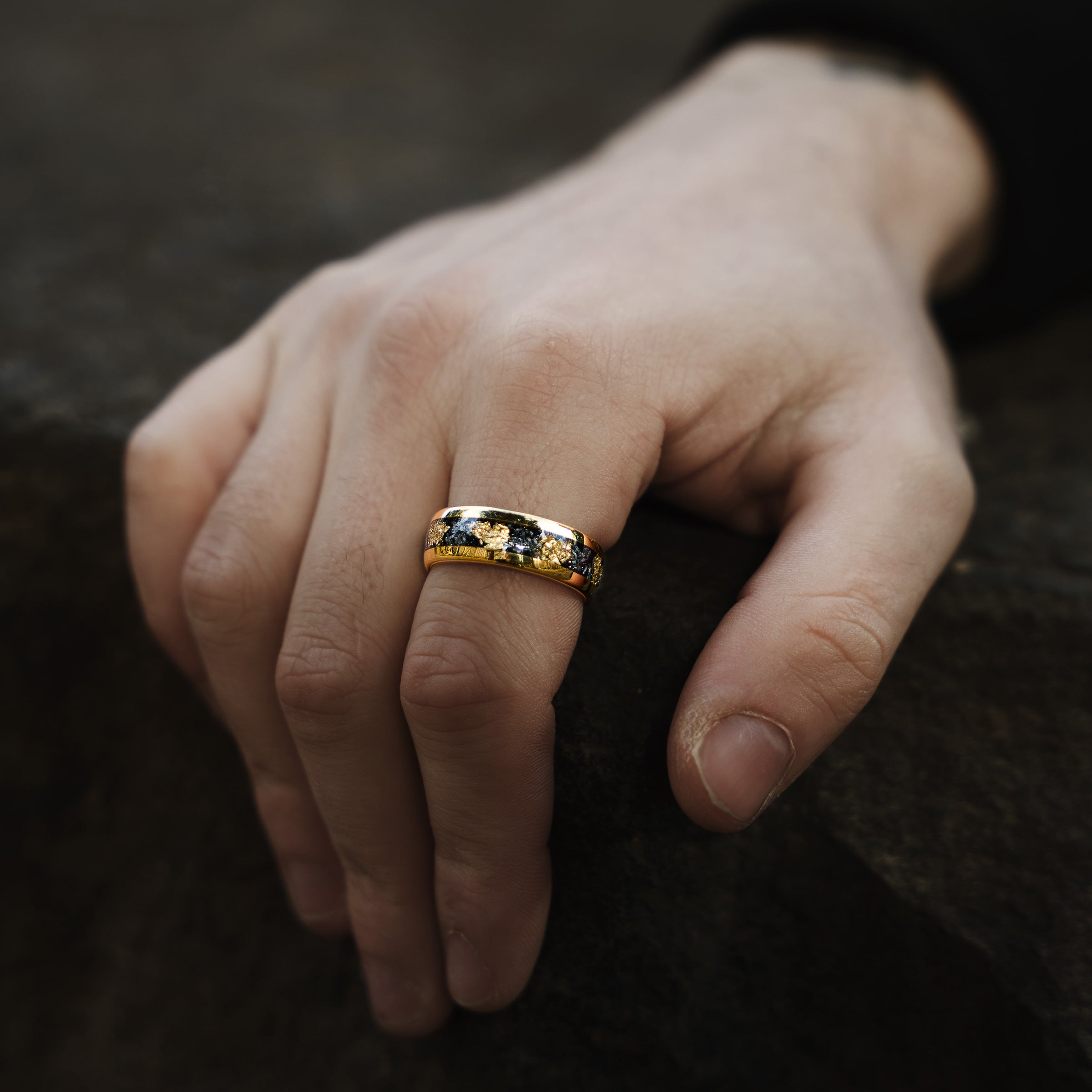 Tungsten is an ultra-dense metal with exceptional hardness and scratch resistance, commonly used in high-performance applications. This ring integrates 18K gold-filled accents, authentic meteorite inlay containing extraterrestrial iron-nickel alloys, and is finished with solid 18K gold leaf, combining advanced materials with refined aesthetics.