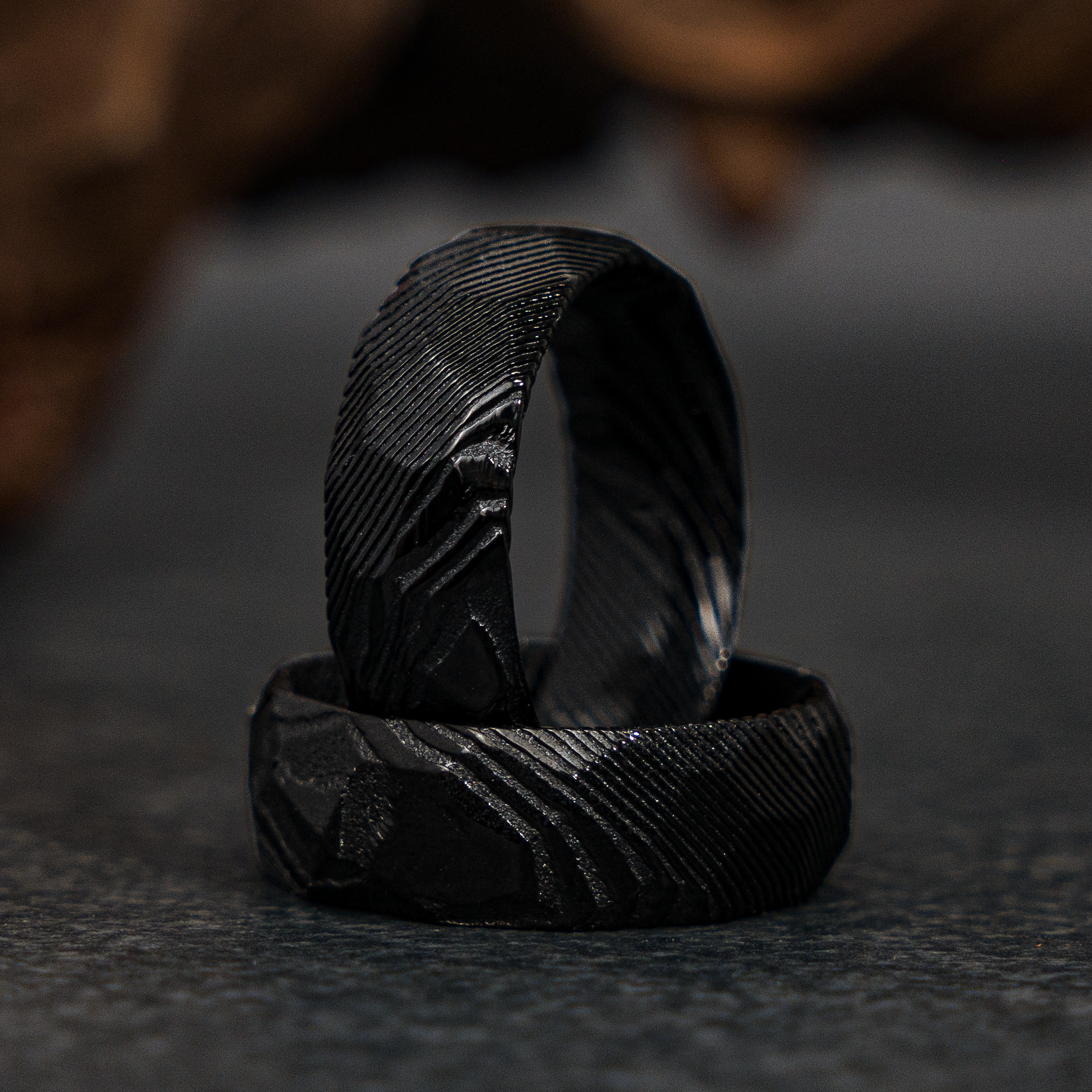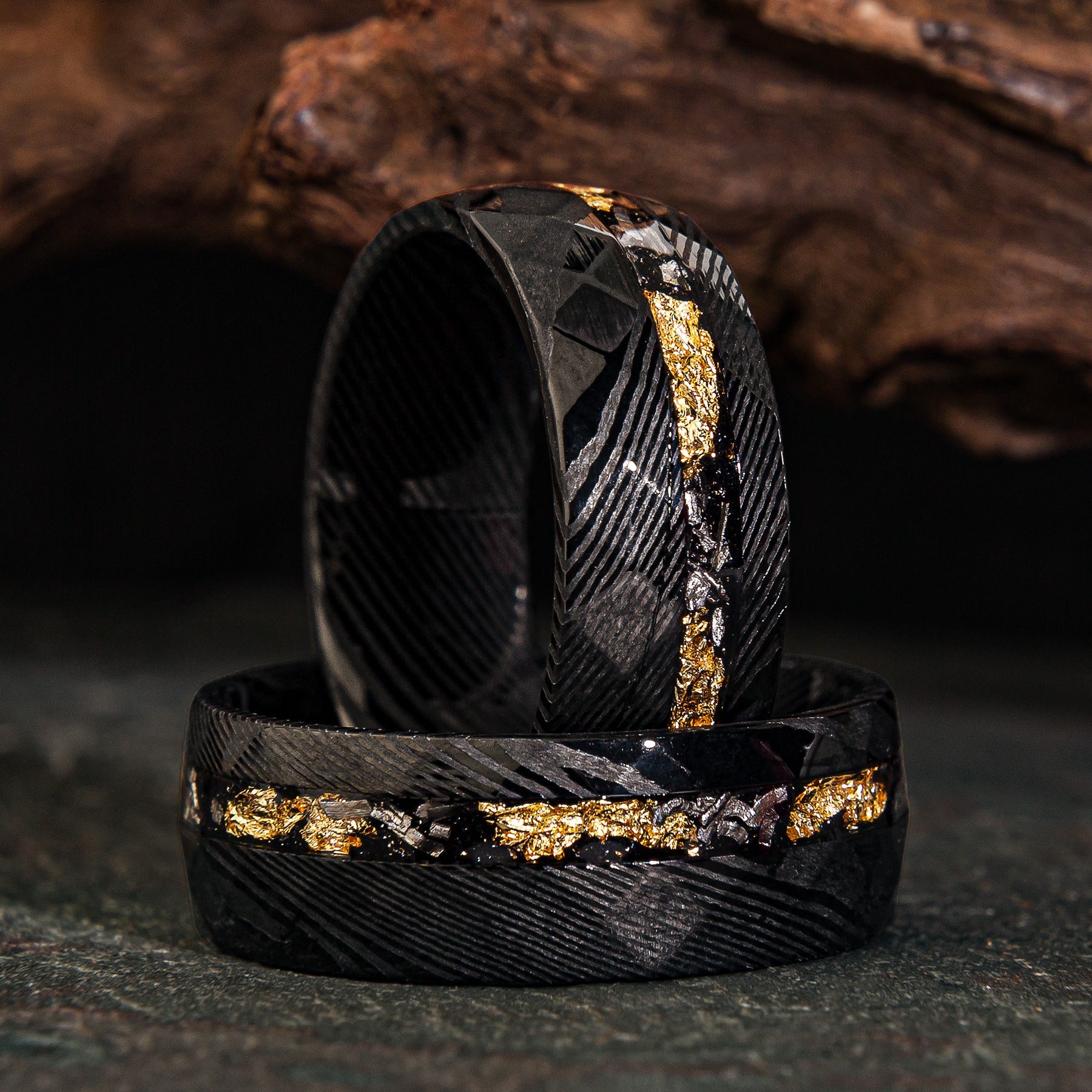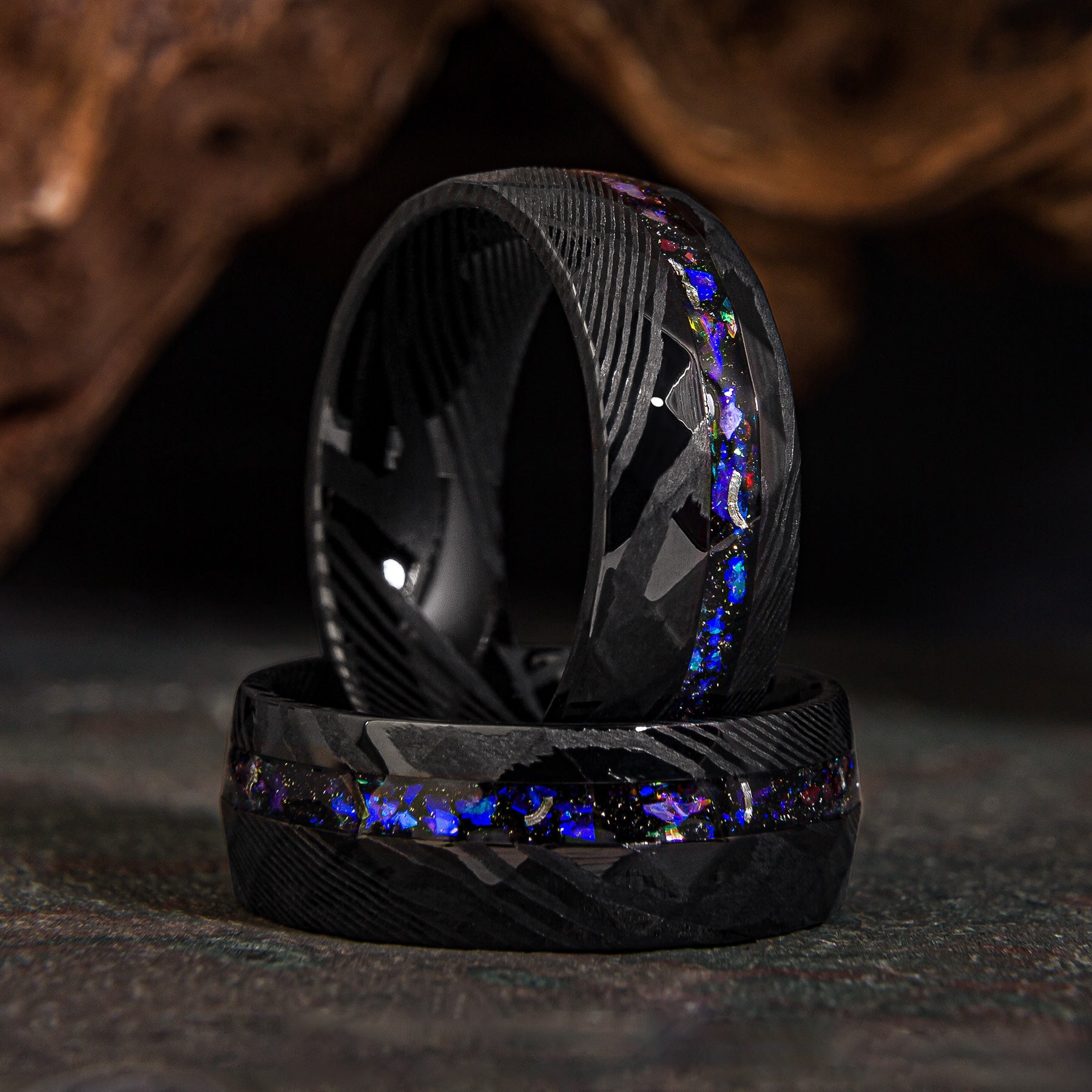 "Dark Cloud" Damascus Mens Ring with Crushed White Gold Flakes 8 mm