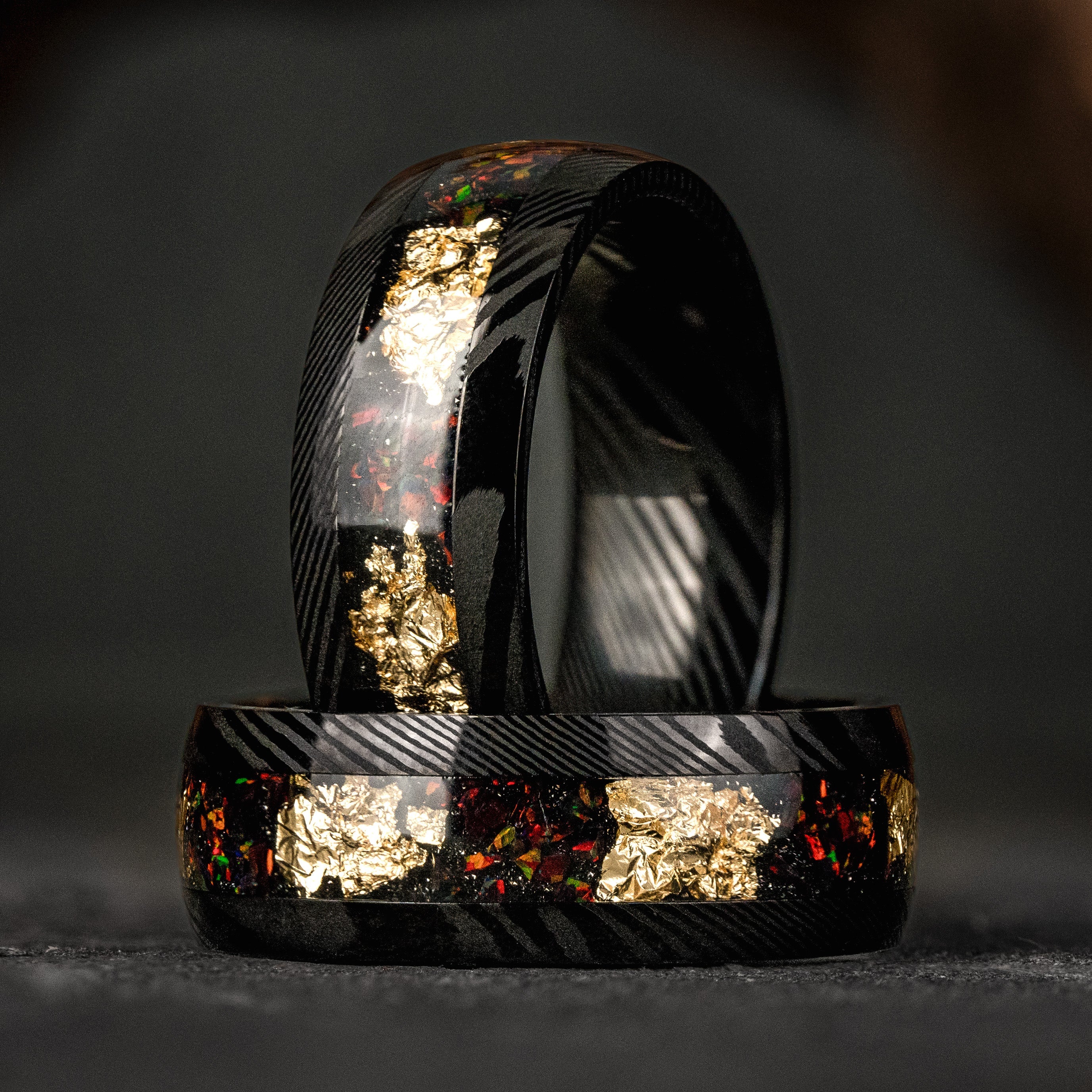 "Red Lava" Damascus Ring with Red Opal and Gold 18K Flakes