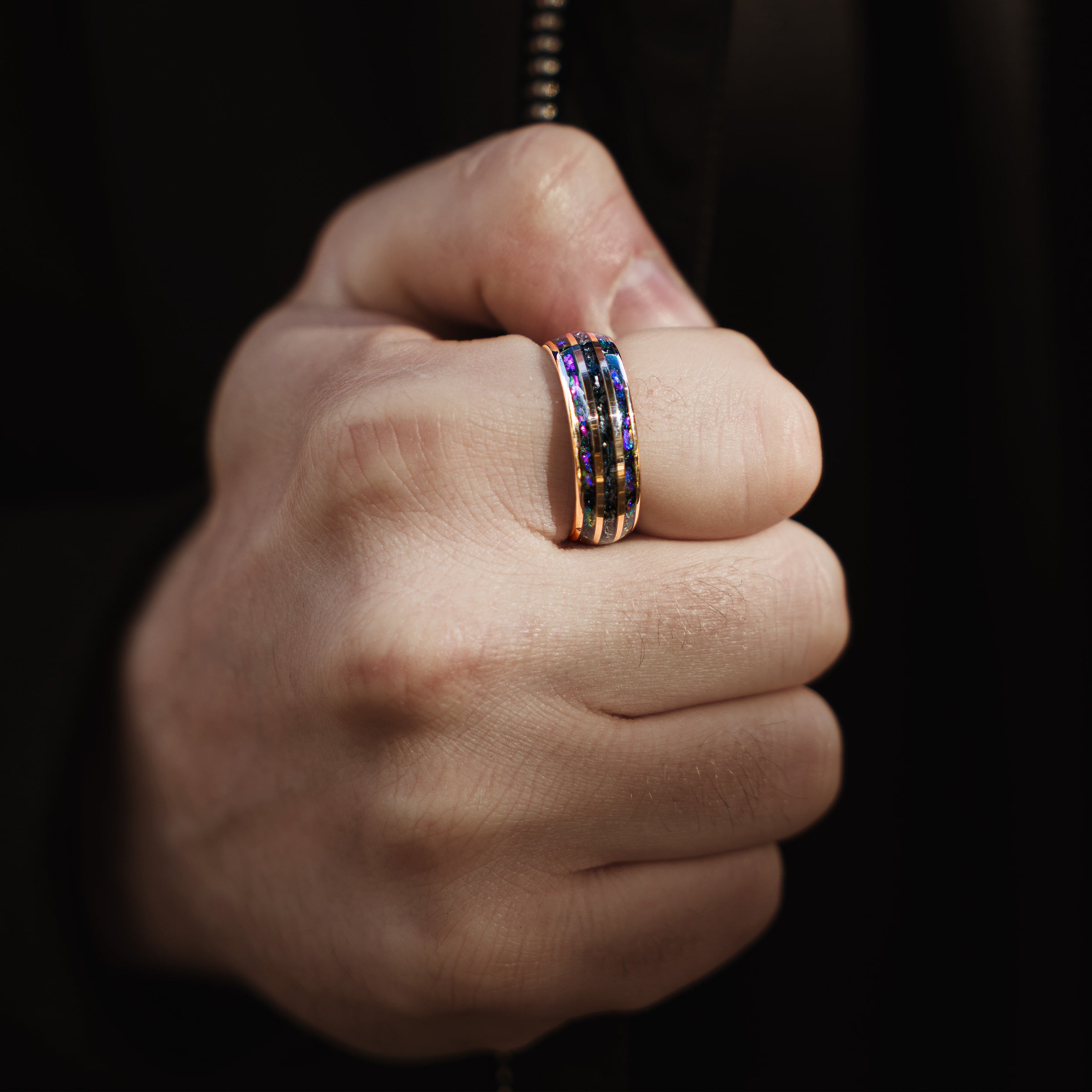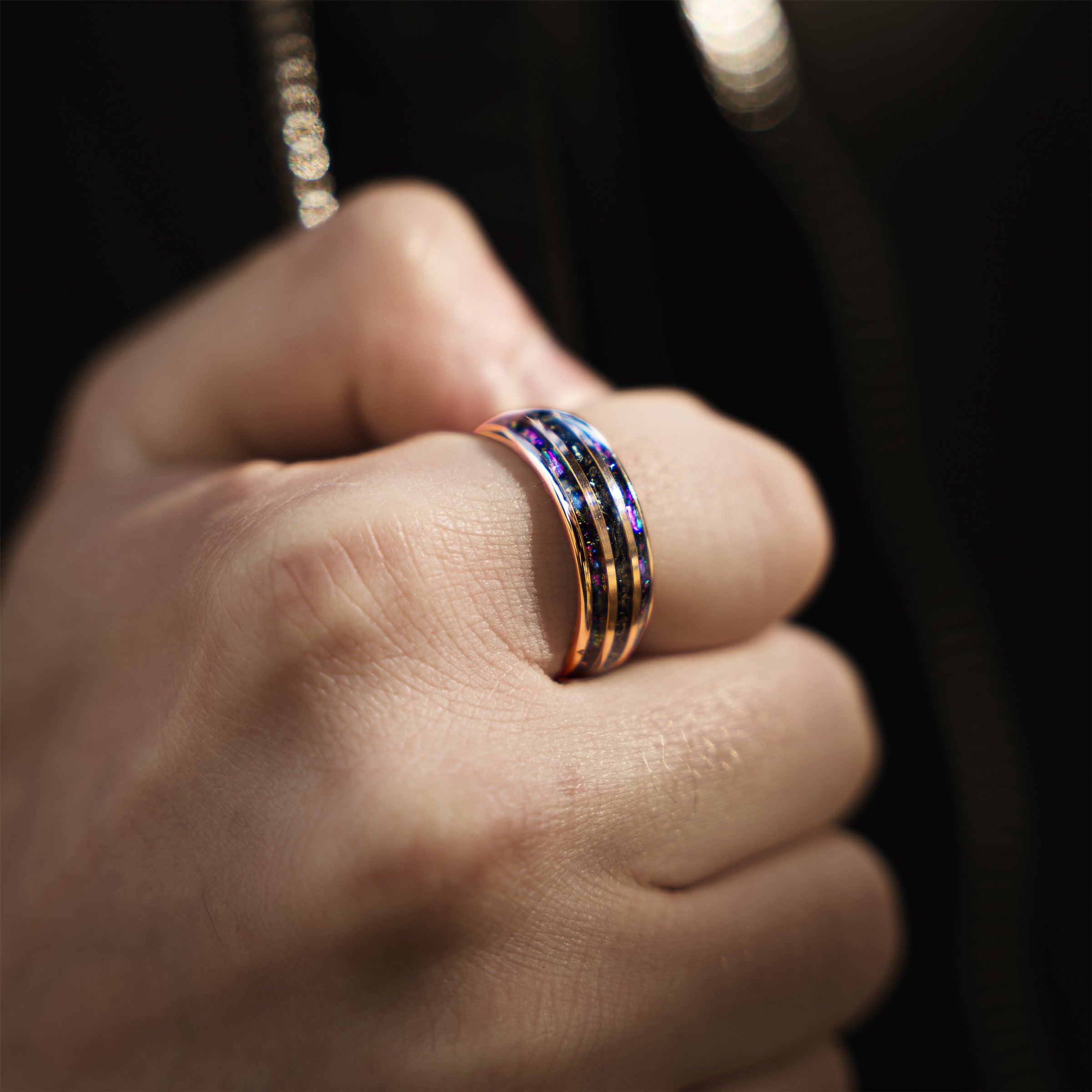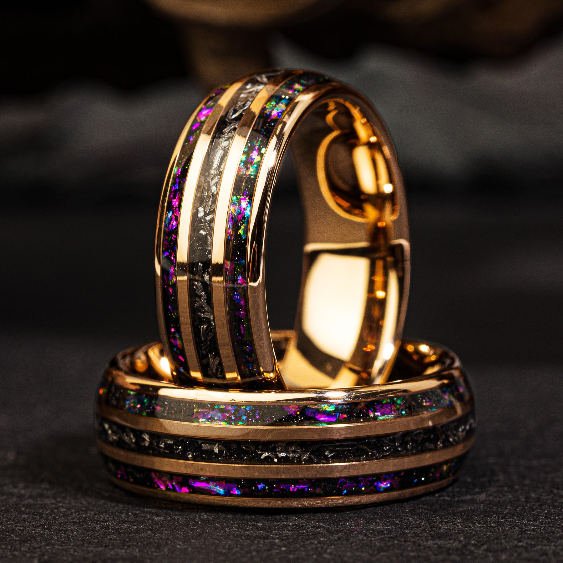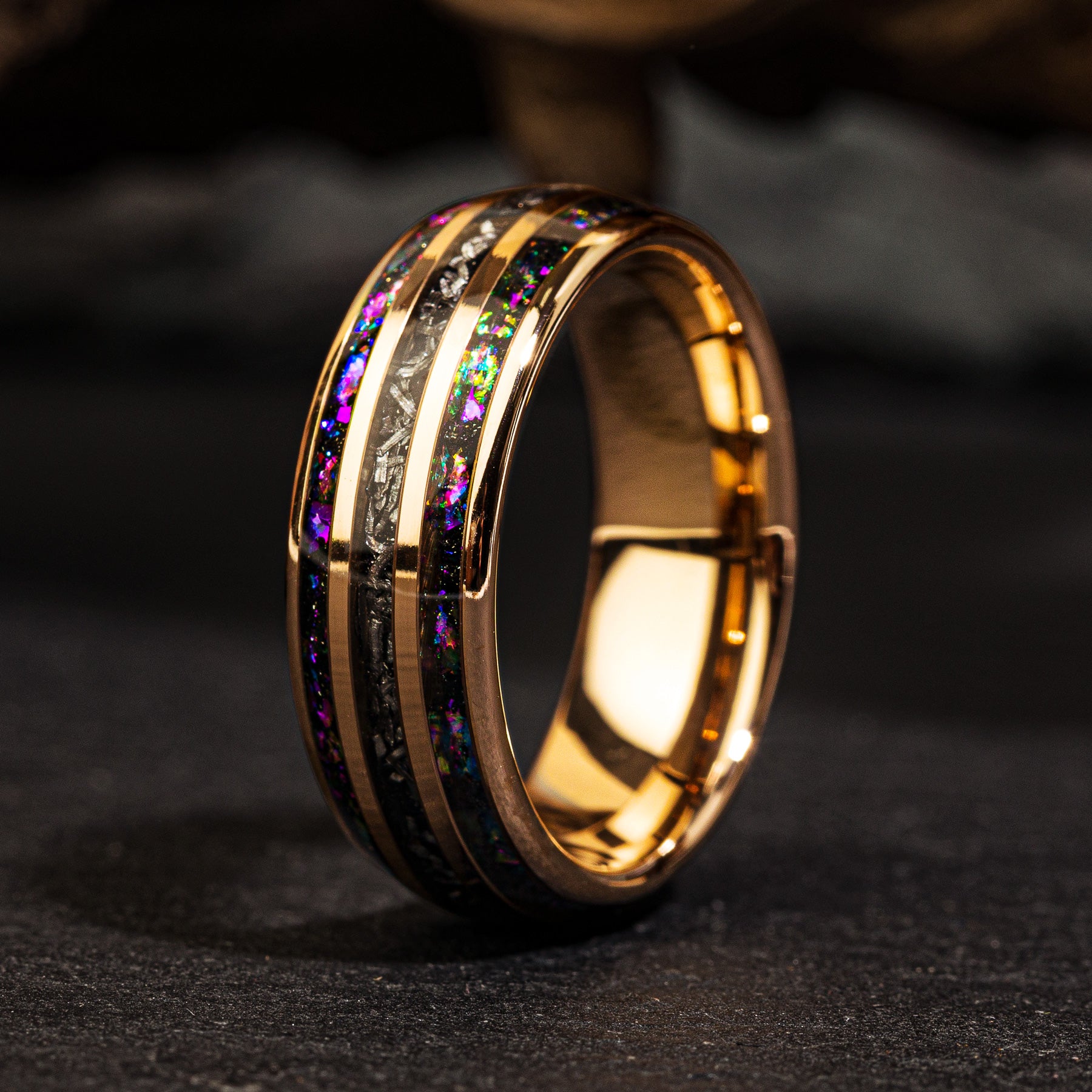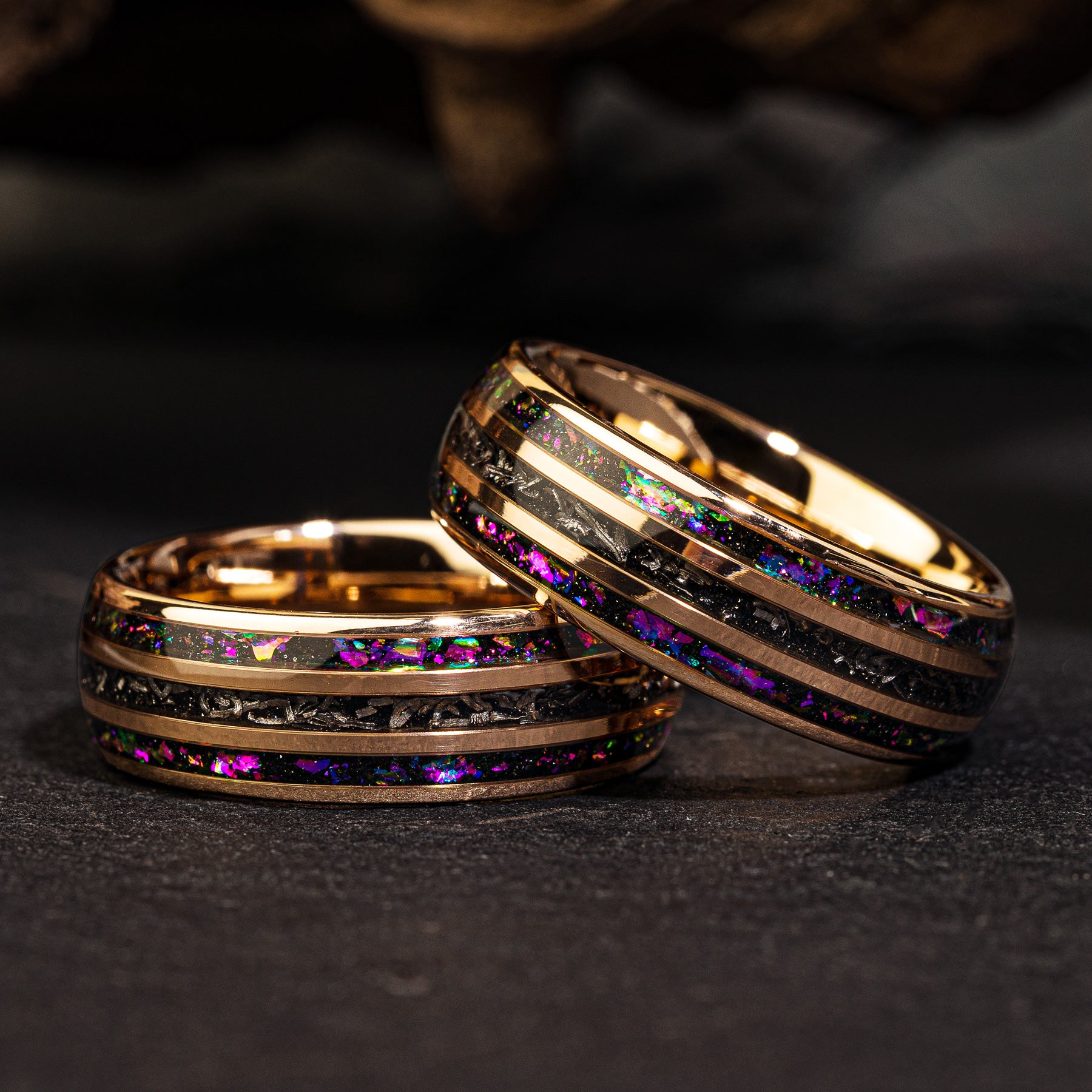 "Fortune" Yellow Tungsten Ring With Meteorite and Purple Opal 8 mm