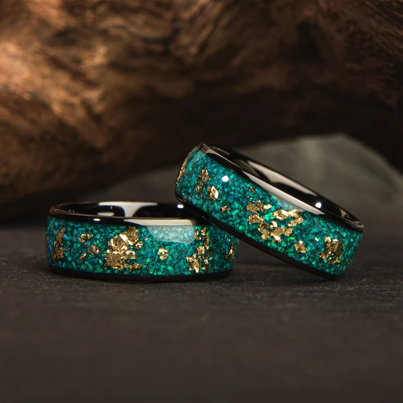 Finish: Polished Tungsten with Iridescent Opal Inlay and Gold Leaf Detailing