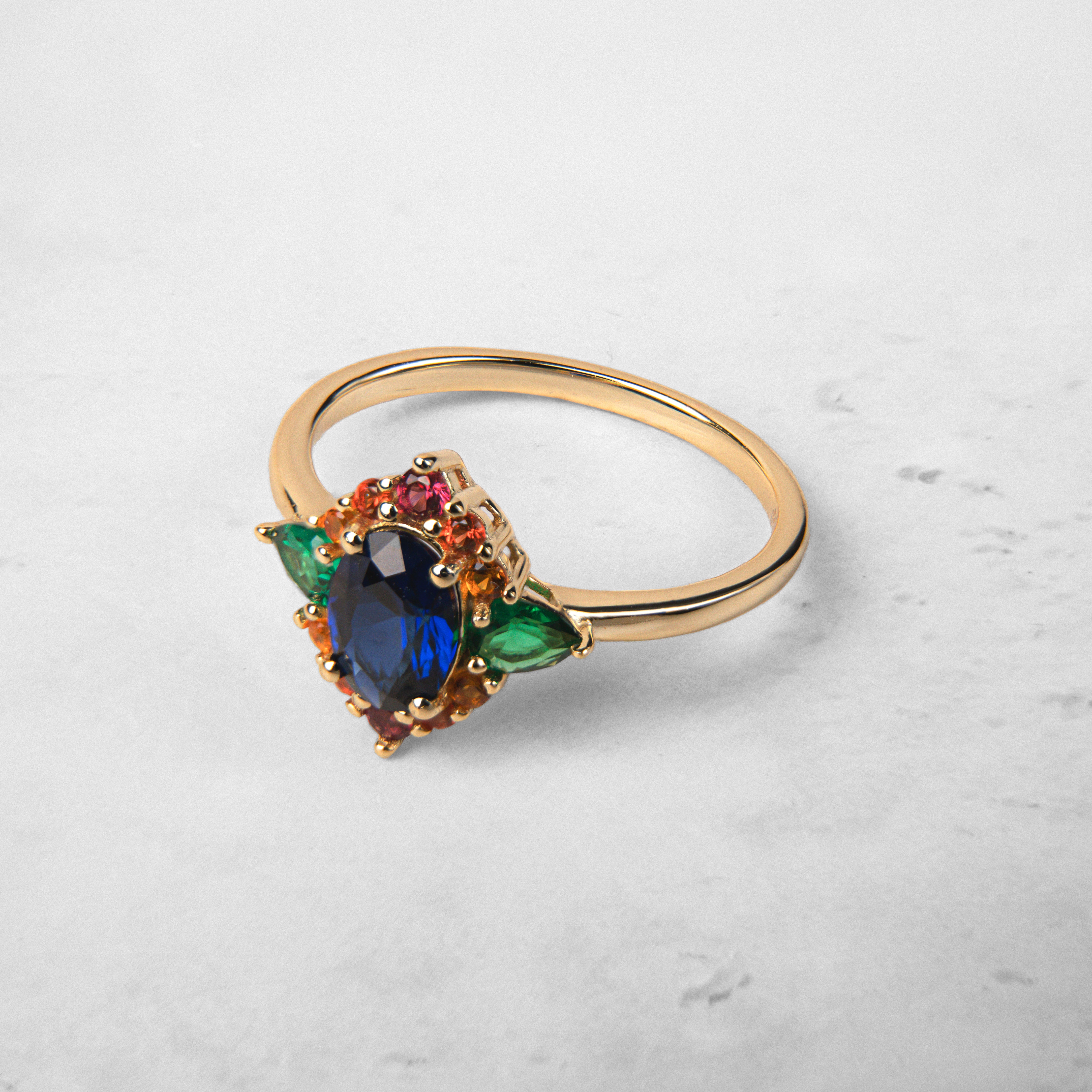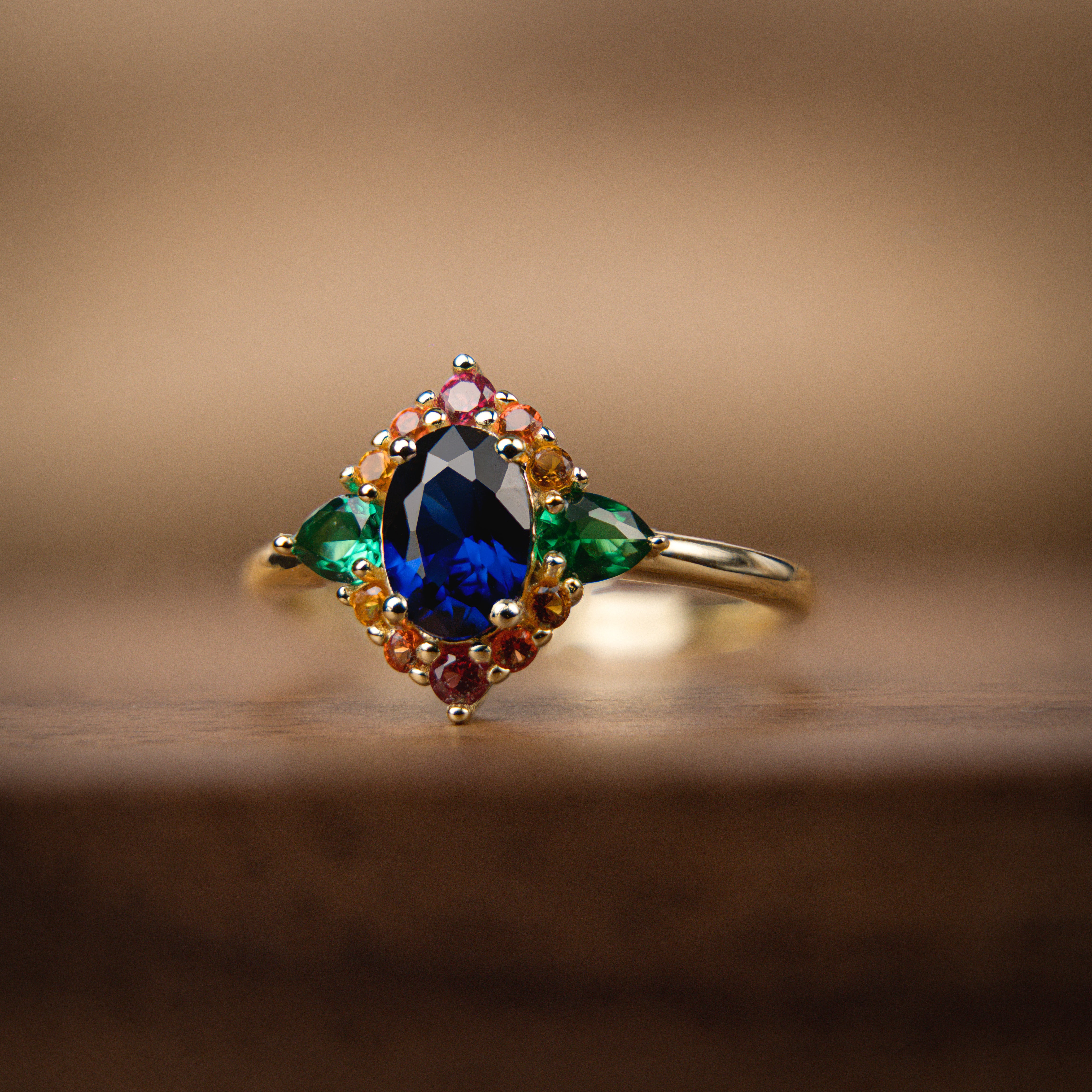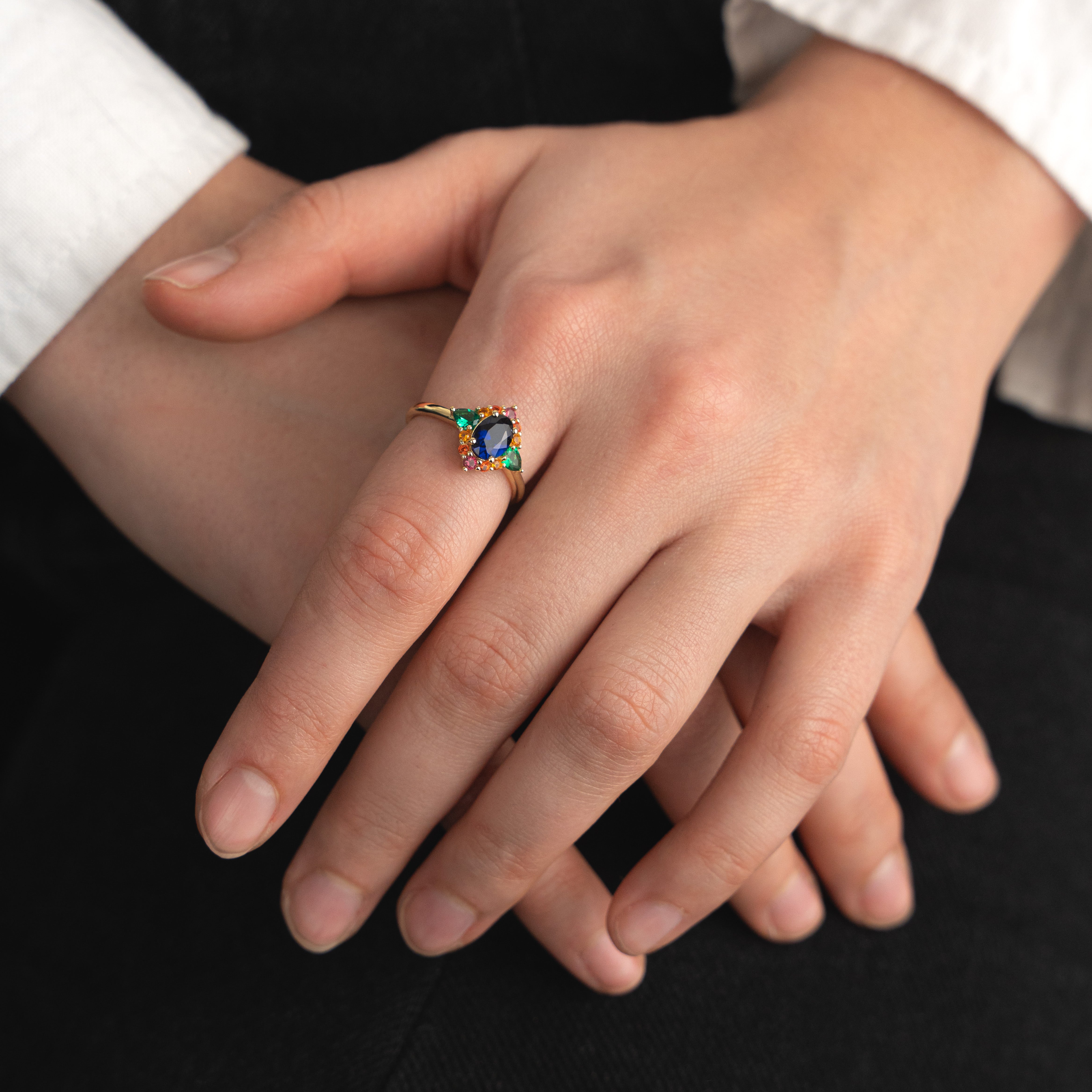"Blue Eye" Sapphire, Emerald with Zircon Women's Sterling Silver 925 Ring