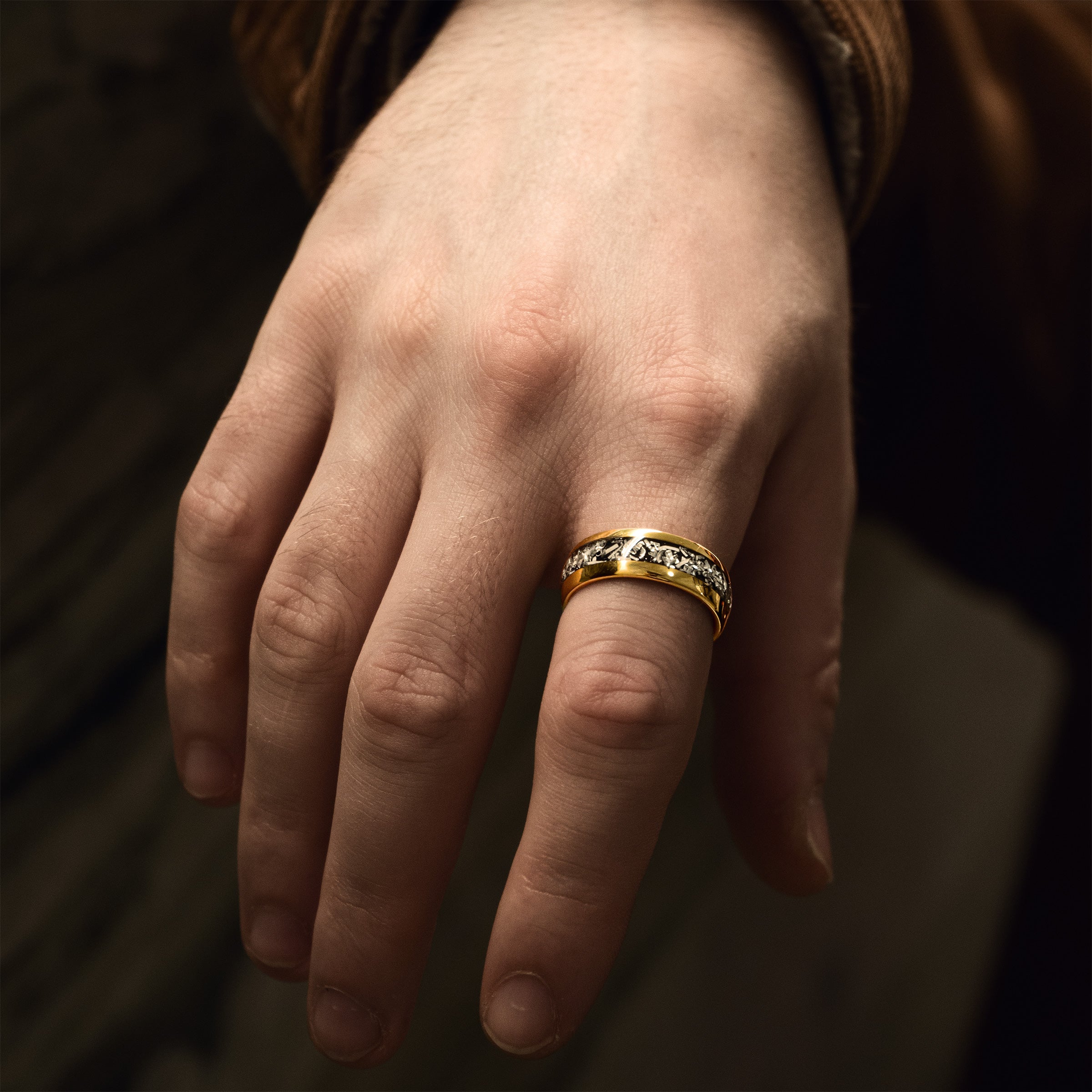 Crafted from durable gold-filled tungsten and inlaid with authentic meteorite fragments, the Cosmos Ring isn’t just jewelry.