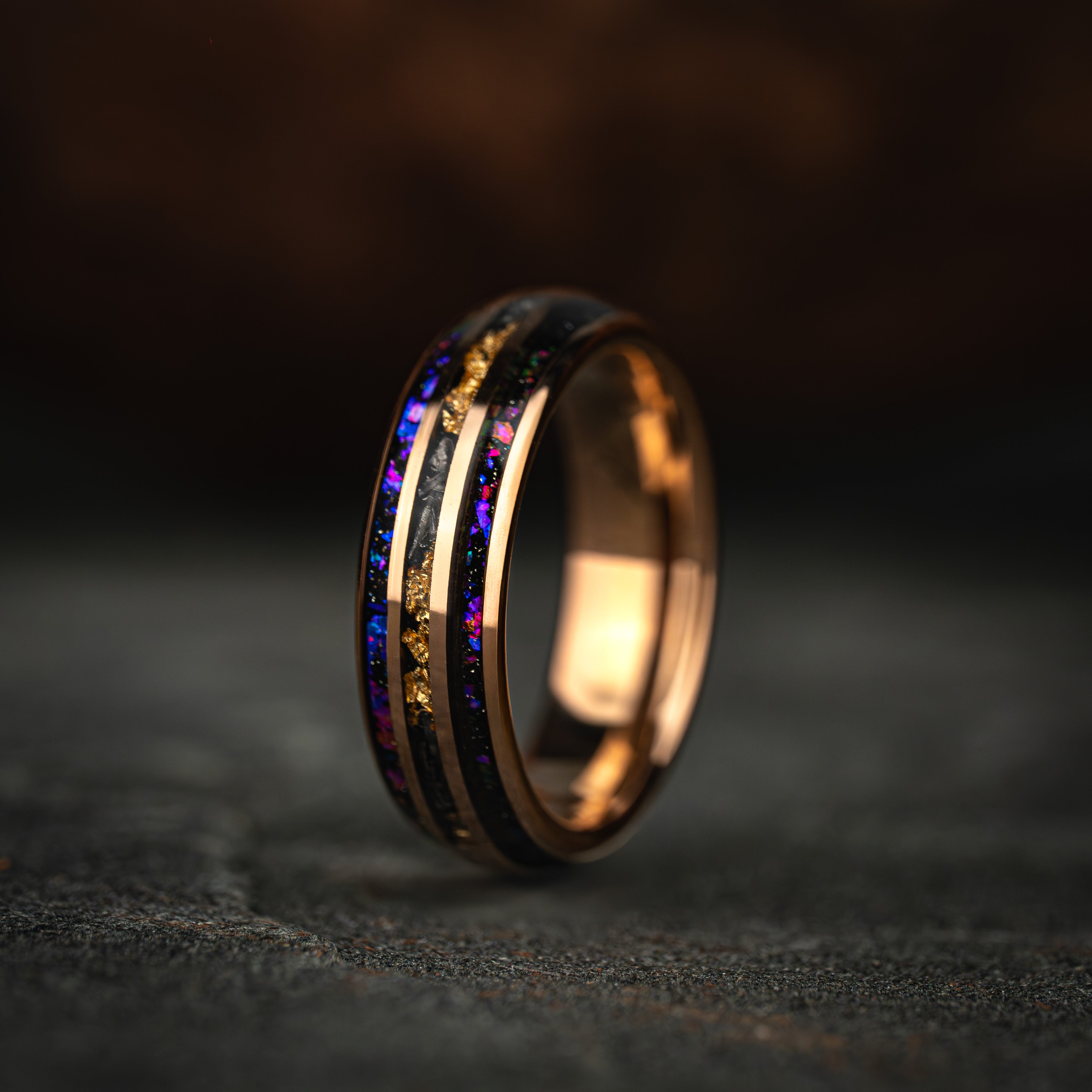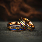 "Blue Pair" Couple Set of Rose Tungsten Ring with Gold 18K Leaf and Blue Opal Inlay 6 mm 8 mm